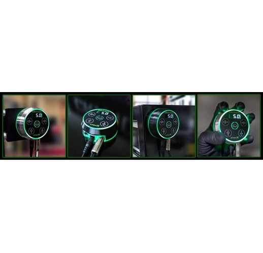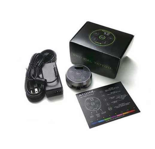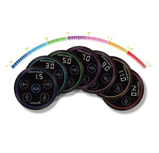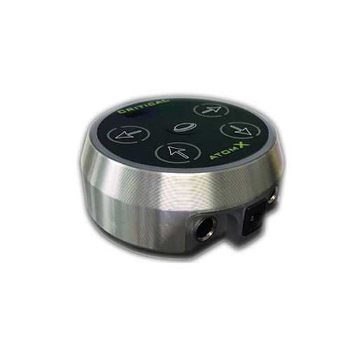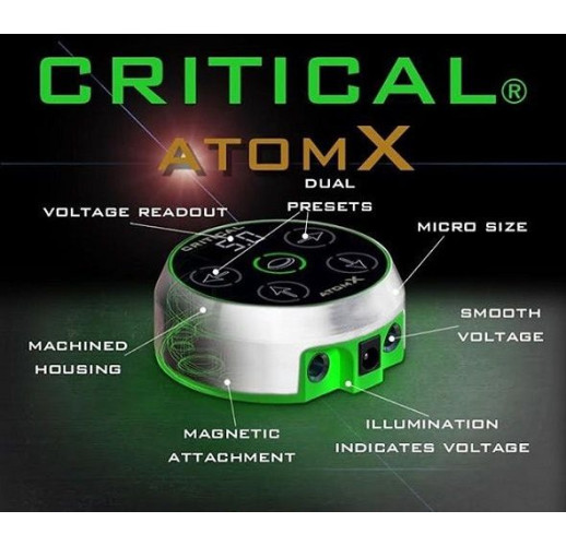 Блок питания Critical Tattoo® Atom X прост в эксплуатации, он заменяет ручку управления из бывшего блока питания Atom на удобные кнопки из моделей CX. Он имеет центральную кнопку для включения и выключения машинки, две кнопки предварительной установки напряжения и две кнопки для увеличения или уменьшения напряжения во время работы. Atom X также имеет тот же уникальный индикатор напряжения, что и блок питания Atom, который меняет цвет в зависимости от настройки напряжения. Он имеет прецизионно регулируемое заданное напряжение в диапазоне от 0 до 17 В. Источник питания также имеет экран отображения напряжения и разрешение настройки 0,1.