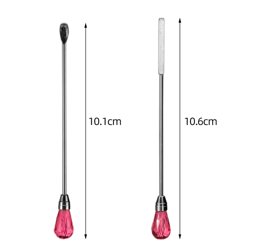 Инструмент выполнен в двух вариантах: в виде ложечки 10.1 см и шпателя 10.6 см., которые позволяют аккуратно смешивать пигмент.