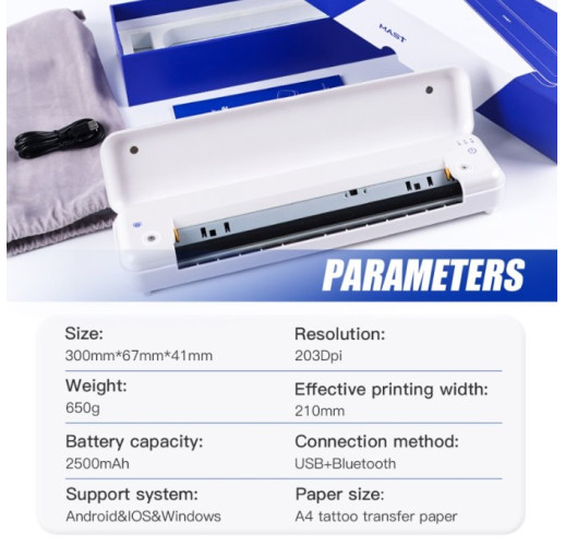 Интеллектуальное управление и простая передача: легко подключайтесь к своему смартфону через приложение для функций интеллектуального тату-устройства, включая инструменты для творческого редактирования. Быстрое редактирование и создание оптимального документа переноса просты, что повышает эффективность. Для универсальности он также поддерживает подключение Type-C к компьютерам для печати.
