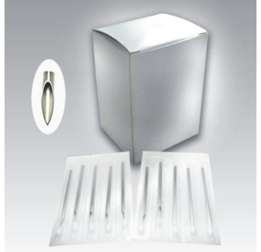 Голки з лазерним заточуванням та тефлоновим покриттям, що дозволяє здійснювати процедуру без використання гелів-мастил для кращого ковзання.