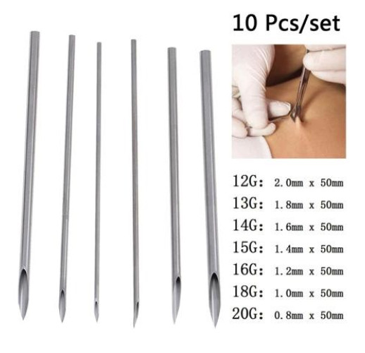 Одноразові стерильні голки для пірсингу, упаковані в стики, в коробці 100 шт., розміри 12G/13G/14G/15G/16G/17G/18G/20G